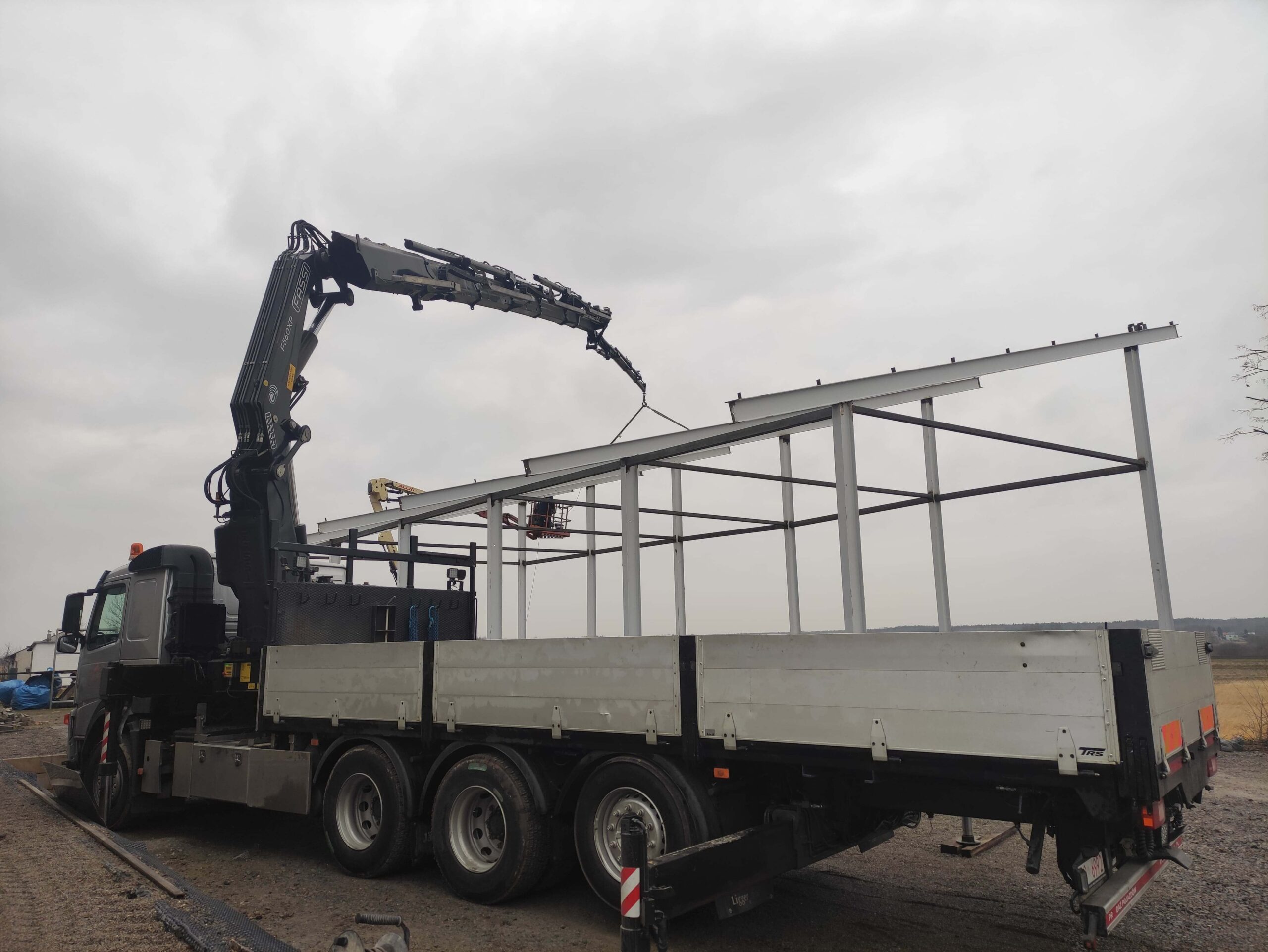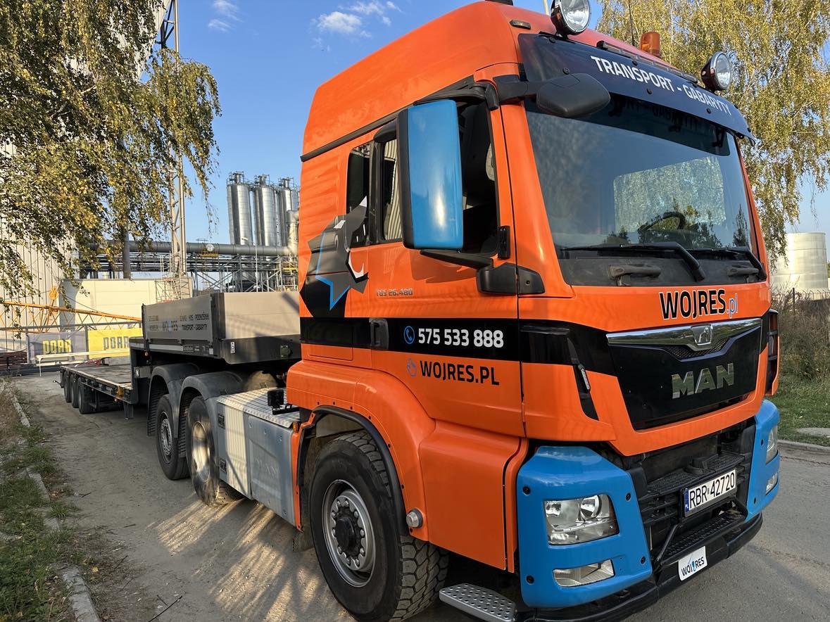 Zestaw składający się z : Trzyosiowego ciągnika MAN TGS 26.480 posiadającego napęd 4x6 z przednim napędem HYDRODRIVE. Naczepy GOLDHOFER posiadającą 3 osie zdalnie skrętne(z pilota) pozwalające na wjazd w nawet trudno dostępne miejsca, 4 metrowy balkon i 9 metrów platformy z możliwością rozciągu o kolejne 6 metrów.