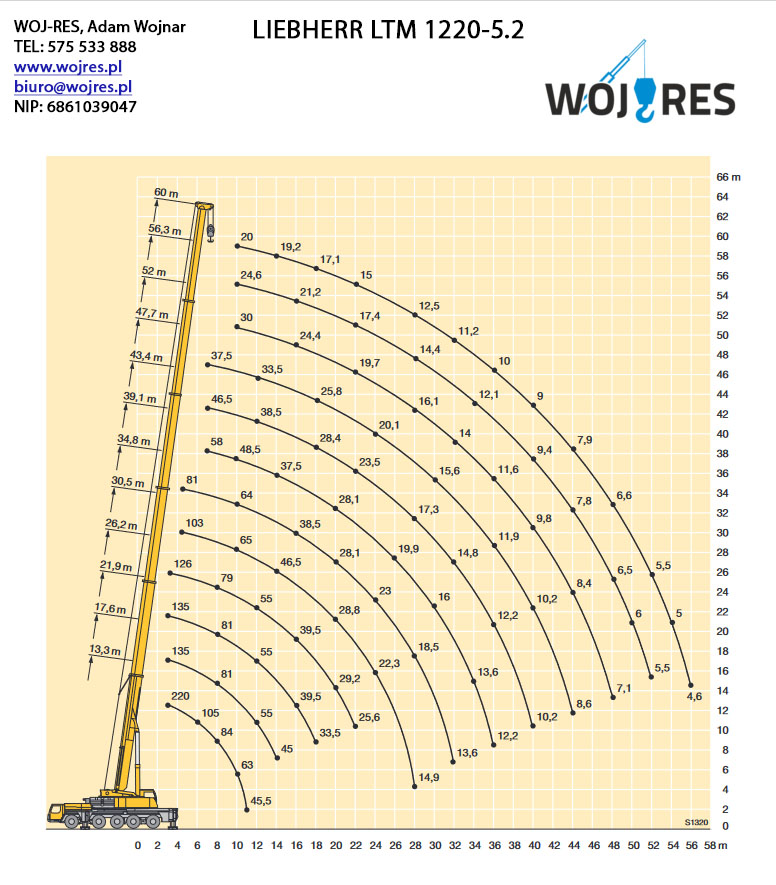 Dźwig samojezdny o maksymalnym udźwigu 220 ton. Długość wysięgnika 60 metrów + 36 metrów bociana łamanego pod kątem 0o, 22,5o i 45o. Promień pracy do 90 metrów, wysokość podnoszenia 96 metrów, wszystkie osie skrętne